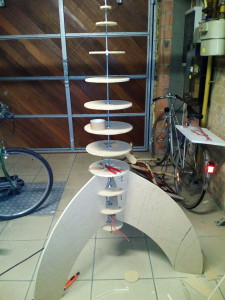 On y va en travaillant tout les pi/2 pour ne pas désaxer la structure. Clou+colle entre balsa et disque.